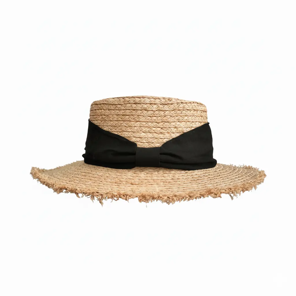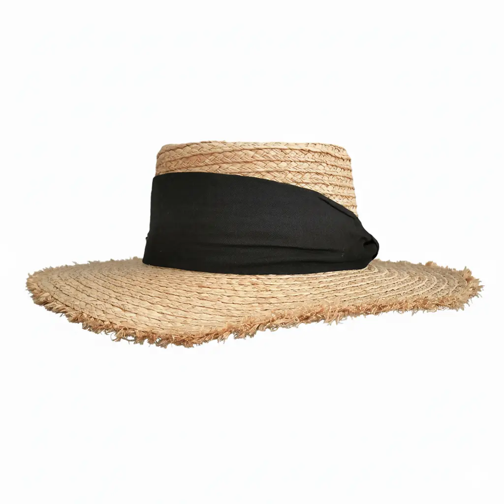 Su diseño casual con borde de ala deshilachada y estilo bohemio te da ese toque fresco y moderno que buscas para cualquier ocasión bajo el sol. La cinta decorativa en color negro crea un contraste elegante que realza la textura natural de la rafia.