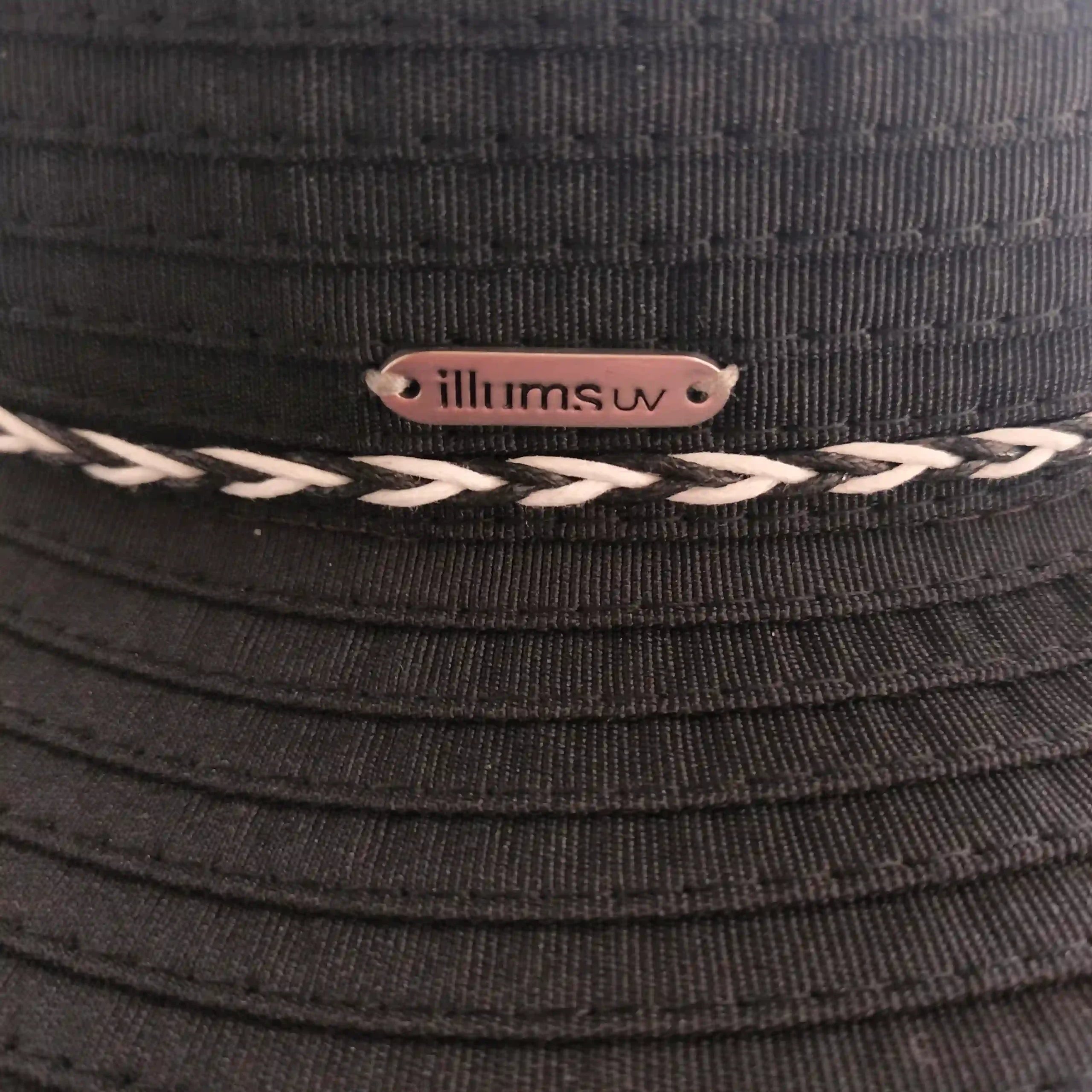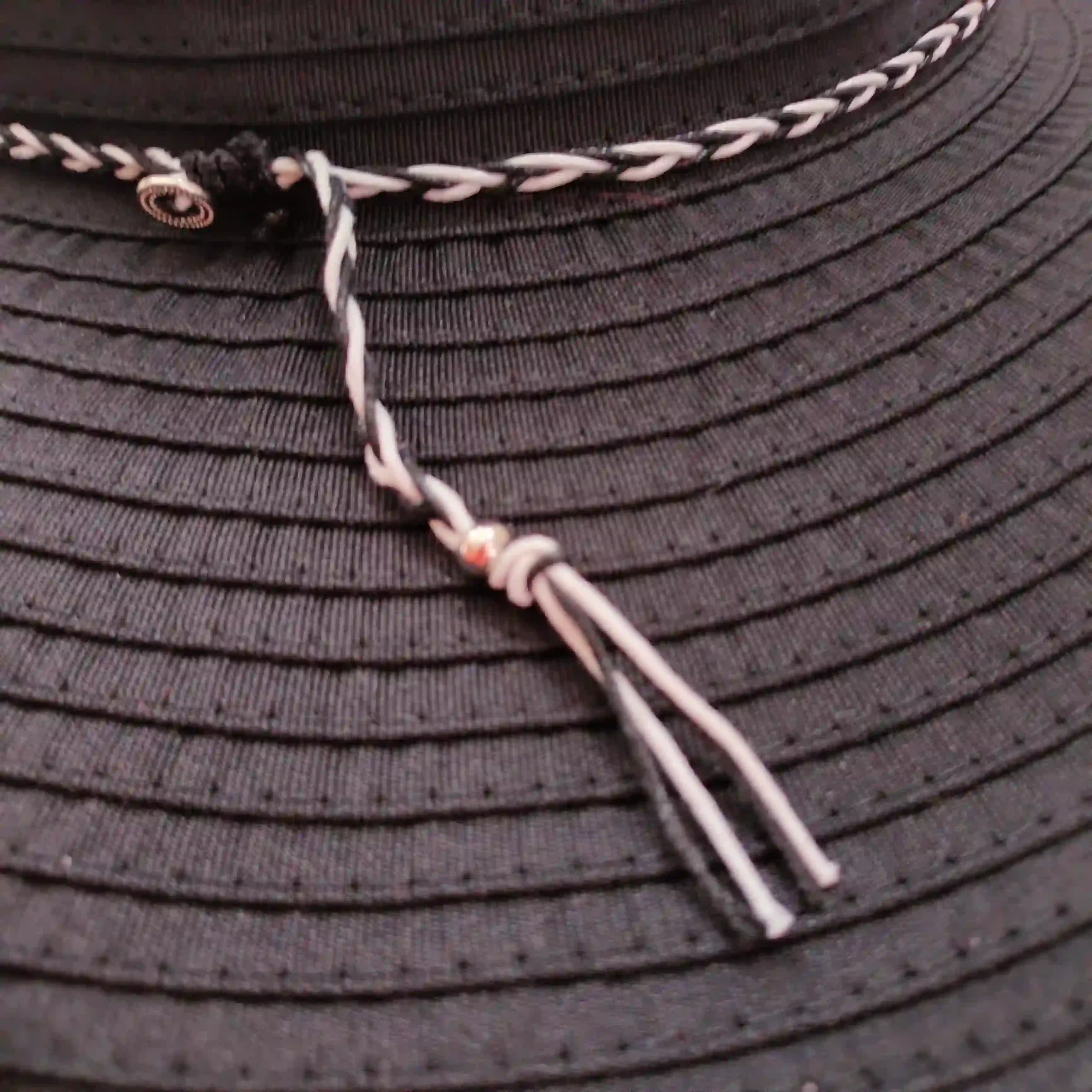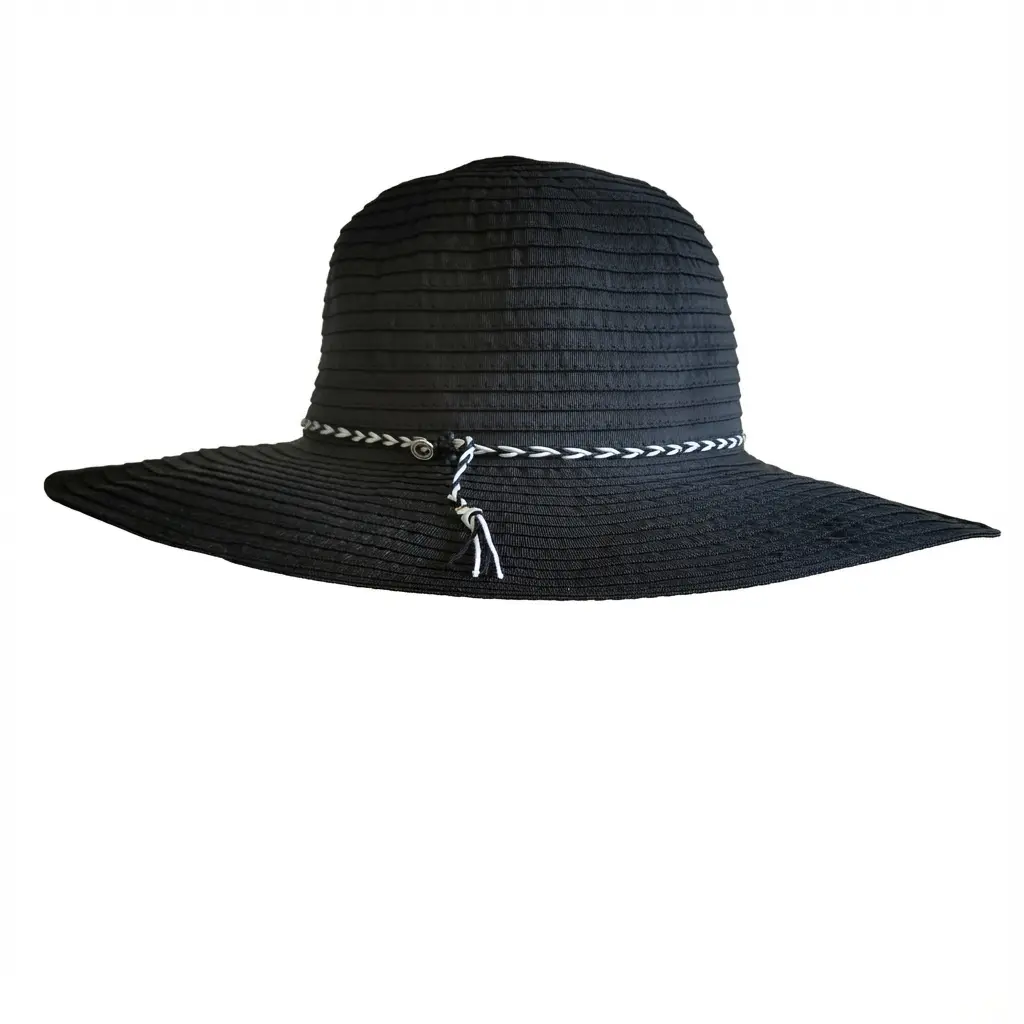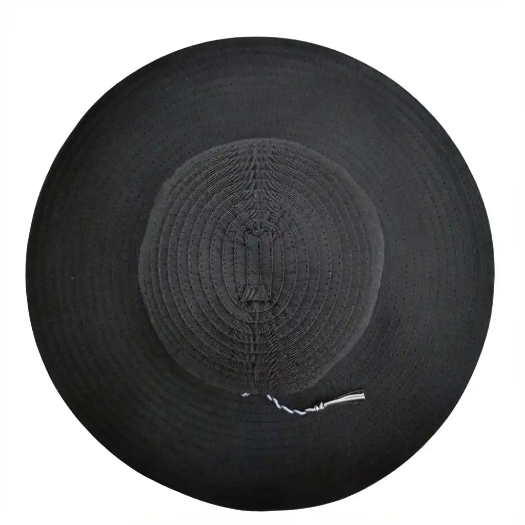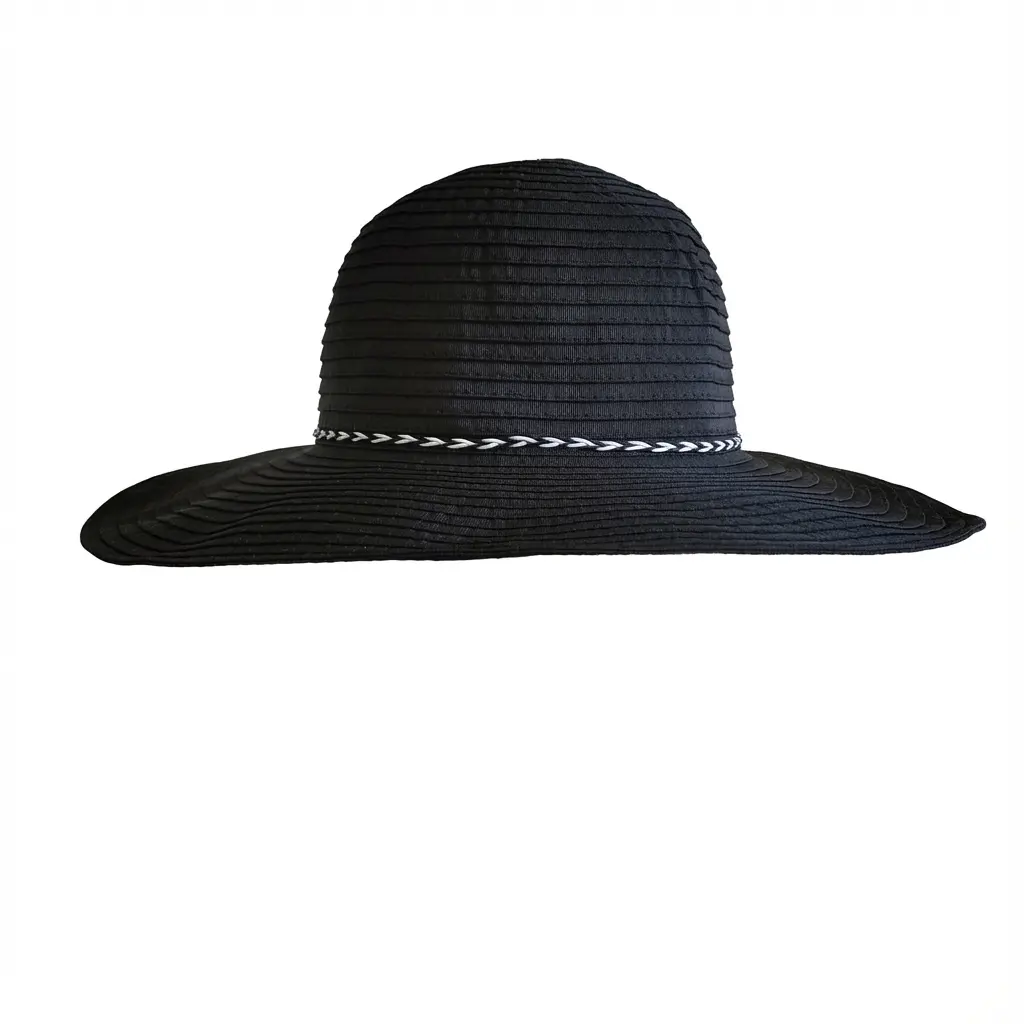 Sombrero negro de mujer con ala moldeable, banda trenzada y protección solar certificada UPF 50+. Protege tu piel con estilo.