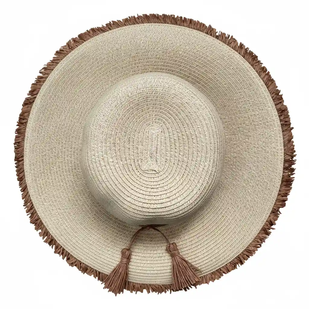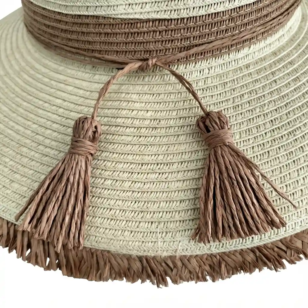 La cinta decorativa y los flecos en la parte posterior hacen de este sombrero una pieza única que se distingue por su carácter alegre y relajado. Su ala ancha de 10 cm te acompaña en cada salida al aire libre, desde días de playa hasta paseos por la ciudad, garantizando que tu piel esté siempre protegida.